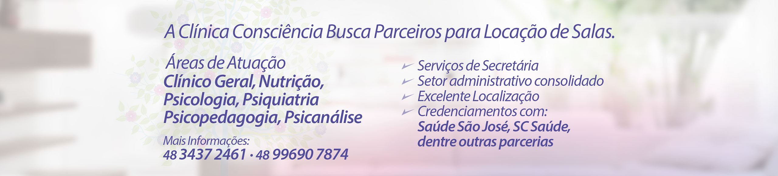 Clínica Consciência A Clínica Consciência trabalha com especialidades que contribuem na saúde e bem estar de seus pacientes. Com o foco em cuidados à saúde mental objetiva proporcionar às pessoas atendidas autoconhecimento além de uma vida saudável, com mais qualidade e desenvolvimento comunicativo. Nossas especialidades auxiliam na promoção de uma vida mais leve, tranquila e com qualidade.
